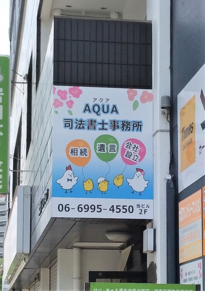 大阪メトロ大日駅7番出口から西(守口方面)に歩道を歩いていただくと、写真のような看板が見えますので、そこが弊所の入居するマンションです。どうぞお気軽にお越しください。